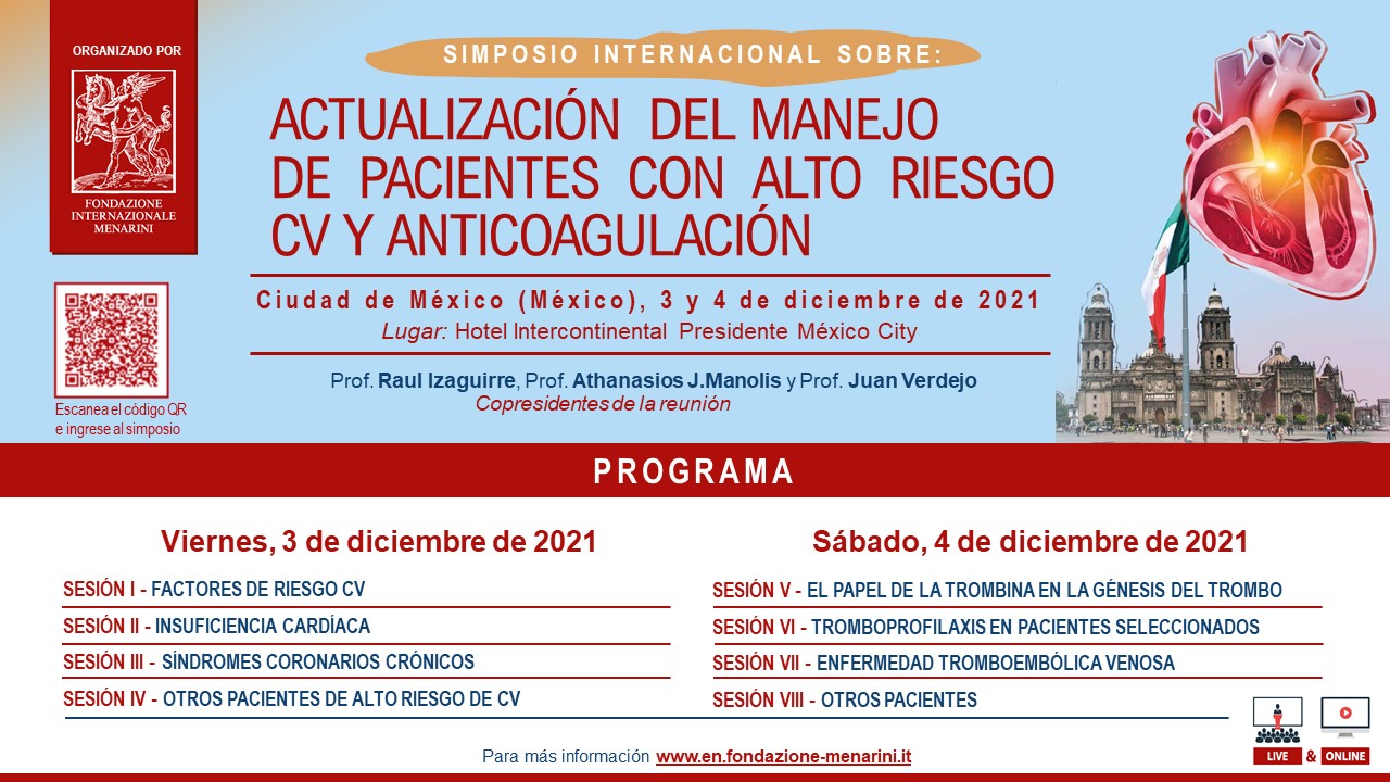 El próximo viernes 3 y sábado 4 de diciembre, la Fundación Menarini Internacional celebrará el próximo simposio internacional sobre “Actualización en el manejo del paciente de alto riesgo CV y anticoagulación”. La transmisión será de forma híbrida, on-line con transmisión en streaming y presencialmente en el Hotel Intercontinental Presidente de Ciudad de México, contará con ponentes de reconocidísimo prestigio internacional y se tratarán temas de gran interés científico como el paciente de alto riesgo cardiovascular y la tromboprofilaxis, entre otros.